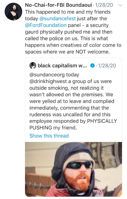A few hours later, back at the condo, we convened around a table and put together an email to Sundance with six collective demands: 1) The termination of employment of the security guard who assaulted Assia, 2) A formal apology from High West Distillery, 3) Sundance to revoke High West’s sponsorship of the festival for violating their Code of Conduct, 4) Racial equity training for all temporary staff and security guards working at the festival, 5) A physical safe space for BIPOC artists at the festival, and 6) An independent investigation culminating in a public report of the structural conditions that allow racism to fester at Sundance.